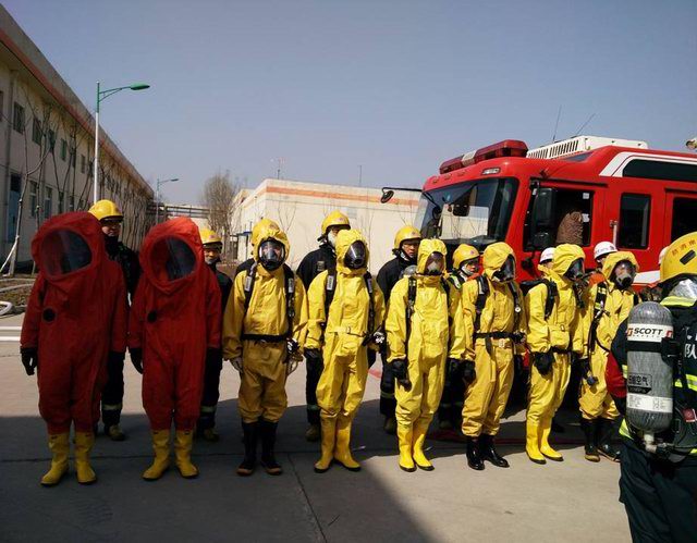 洛陽(yáng)市消防支隊(duì)王榮范參謀長(zhǎng)、西工區(qū)消防大隊(duì)劉學(xué)康大隊(duì)長(zhǎng)及洛陽(yáng)正大總裁辦喬光斌總經(jīng)理、食品事業(yè)部杜光輝副總經(jīng)理一行在演練前到達(dá)演練場(chǎng)地進(jìn)行安排部署,成立了消防演練現(xiàn)場(chǎng)指揮部,由洛陽(yáng)市消防支隊(duì)王榮范參謀長(zhǎng)任指揮長(zhǎng)。演練假設(shè)正大食品有限公司制冷機(jī)房因設(shè)備發(fā)生故障,液氨罐發(fā)生泄漏,1名操作人員受困,現(xiàn)場(chǎng)人員立即向公司領(lǐng)導(dǎo)匯報(bào)并撥打119尋求支援。119指揮中心在接到報(bào)警后,由洛陽(yáng)市消防支隊(duì)協(xié)調(diào),迅速調(diào)集澗西消防大隊(duì)下屬谷水中隊(duì),西工區(qū)消防大隊(duì)下屬車站中隊(duì)、紅山中隊(duì)迅速趕赴現(xiàn)場(chǎng),與此同時(shí)正大食品有限公司迅速啟動(dòng)單位應(yīng)急預(yù)案,組織員工疏散。十五分鐘后,紅山消防中隊(duì)6臺(tái)消防車、2臺(tái)救護(hù)車到達(dá)現(xiàn)場(chǎng),消防戰(zhàn)士著防化服立即進(jìn)入現(xiàn)場(chǎng),對(duì)氨中毒人員進(jìn)行搶救,對(duì)氨泄漏部位進(jìn)行應(yīng)急處置。二十分鐘后谷水中隊(duì)、車站中隊(duì)6臺(tái)消防車達(dá)到現(xiàn)場(chǎng)支援, 50余名消防員展開救援戰(zhàn)斗,用消防水槍噴水中和泄漏的氨氣,降低空氣中氨的濃度。經(jīng)過近一個(gè)小時(shí)的搶維修,氨泄漏得到控制,演練指揮中心宣布本次演練***結(jié)束。