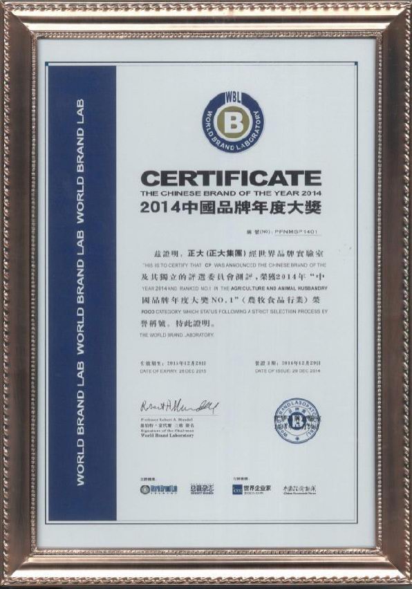 2014年12月29日,“總裁世界年會”在北京東方君悅大酒店舉行。本次大會揭曉了享有“中國品牌奧斯卡”之稱的 “世界品牌實(shí)驗(yàn)室2014年中國品牌年度大獎”評選結(jié)果,正大集團(tuán)、中國國航、國家電網(wǎng)、騰訊控股、中國人壽、中國國旅、北汽集團(tuán)、華為技術(shù)、長虹電器等30個活躍在中國經(jīng)濟(jì)舞臺的領(lǐng)軍品牌榮獲 “中國品牌年度大獎”,正大集團(tuán)以在農(nóng)牧食品業(yè)多年的探索實(shí)踐和管理經(jīng)驗(yàn),以及良好的產(chǎn)品品質(zhì)和品牌知名度,榮獲農(nóng)牧食品行業(yè)“中國品牌年度大獎***”榮譽(yù)稱號。哈佛商學(xué)院教授約翰?戴騰博士(John Deighton)、耶魯大學(xué)管理學(xué)院教授萊維·多爾博士(Ravi Dhar)分別進(jìn)行頒獎及致詞。