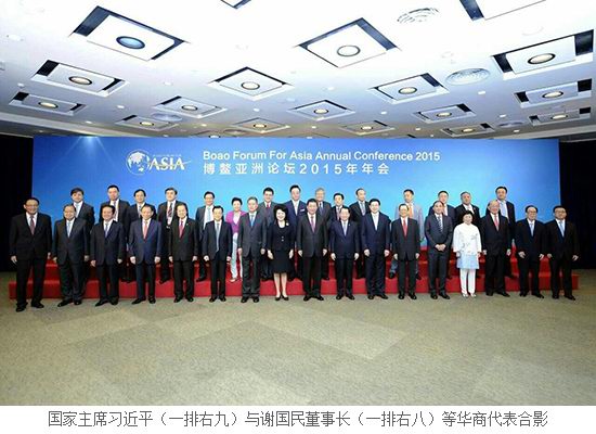 3月26-29日,博鰲亞洲論壇2015年年會在海南省博鰲舉行,本屆年會主題為“亞洲新未來:邁向命運共同體”。3月28日,國家主席習近平出席了年會開幕式,發(fā)表了題為《邁向命運共同體 開創(chuàng)亞洲新未來》的主旨演講,并與正大集團謝國民董事長等出席博鰲亞洲論壇2015年年會的華商代表合影留念。