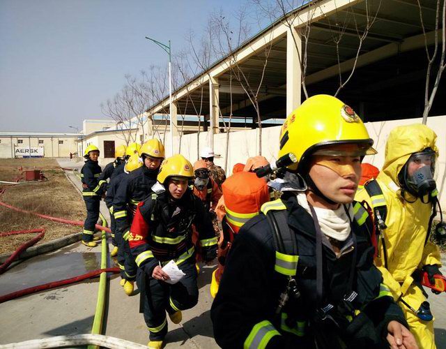 洛陽(yáng)市消防支隊(duì)王榮范參謀長(zhǎng)、西工區(qū)消防大隊(duì)劉學(xué)康大隊(duì)長(zhǎng)及洛陽(yáng)正大總裁辦喬光斌總經(jīng)理、食品事業(yè)部杜光輝副總經(jīng)理一行在演練前到達(dá)演練場(chǎng)地進(jìn)行安排部署,成立了消防演練現(xiàn)場(chǎng)指揮部,由洛陽(yáng)市消防支隊(duì)王榮范參謀長(zhǎng)任指揮長(zhǎng)。演練假設(shè)正大食品有限公司制冷機(jī)房因設(shè)備發(fā)生故障,液氨罐發(fā)生泄漏,1名操作人員受困,現(xiàn)場(chǎng)人員立即向公司領(lǐng)導(dǎo)匯報(bào)并撥打119尋求支援。119指揮中心在接到報(bào)警后,由洛陽(yáng)市消防支隊(duì)協(xié)調(diào),迅速調(diào)集澗西消防大隊(duì)下屬谷水中隊(duì),西工區(qū)消防大隊(duì)下屬車站中隊(duì)、紅山中隊(duì)迅速趕赴現(xiàn)場(chǎng),與此同時(shí)正大食品有限公司迅速啟動(dòng)單位應(yīng)急預(yù)案,組織員工疏散。十五分鐘后,紅山消防中隊(duì)6臺(tái)消防車、2臺(tái)救護(hù)車到達(dá)現(xiàn)場(chǎng),消防戰(zhàn)士著防化服立即進(jìn)入現(xiàn)場(chǎng),對(duì)氨中毒人員進(jìn)行搶救,對(duì)氨泄漏部位進(jìn)行應(yīng)急處置。二十分鐘后谷水中隊(duì)、車站中隊(duì)6臺(tái)消防車達(dá)到現(xiàn)場(chǎng)支援, 50余名消防員展開救援戰(zhàn)斗,用消防水槍噴水中和泄漏的氨氣,降低空氣中氨的濃度。經(jīng)過近一個(gè)小時(shí)的搶維修,氨泄漏得到控制,演練指揮中心宣布本次演練***結(jié)束。